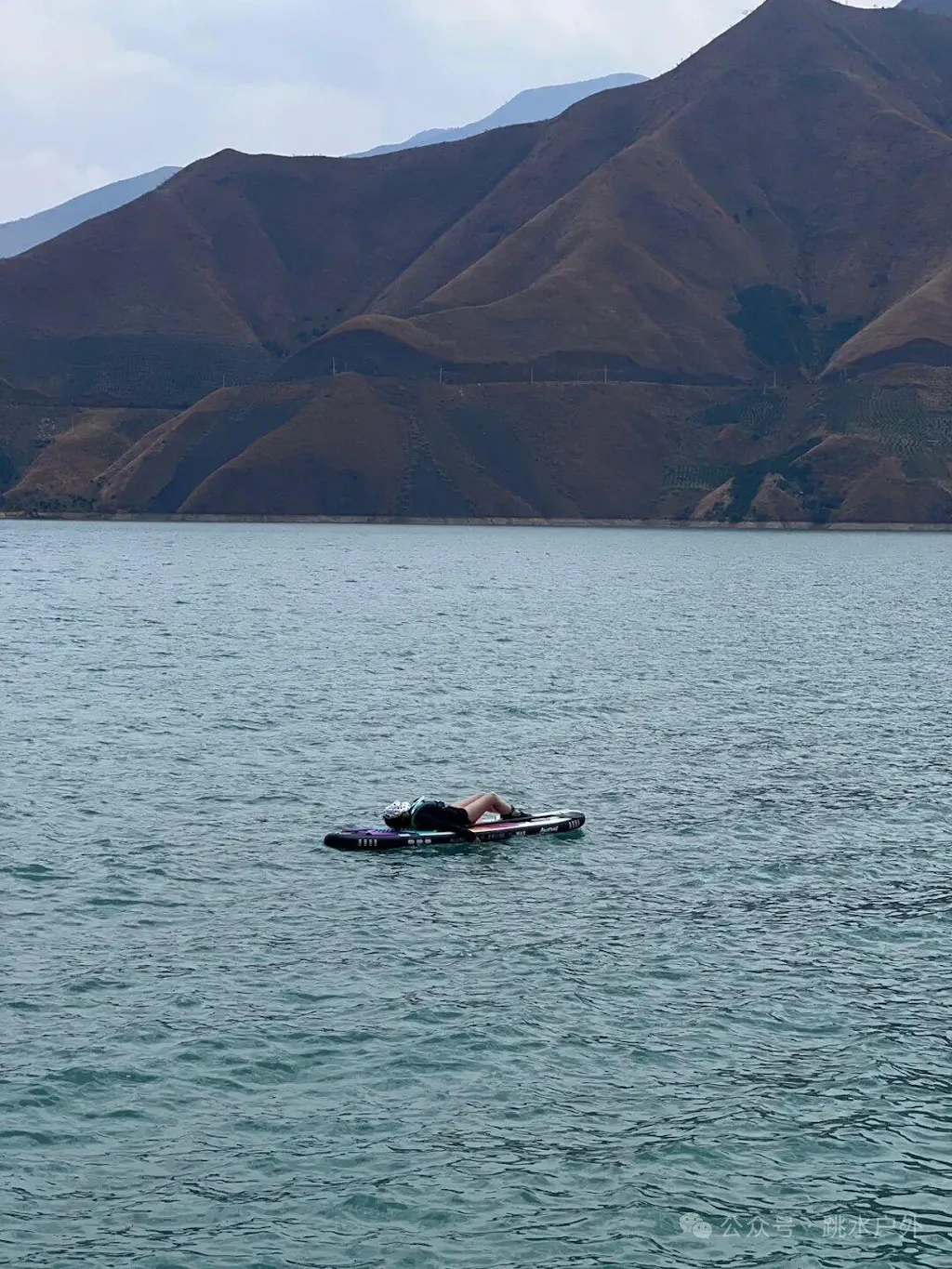 上午的江面非常平静,阳光洒在蓝绿色的金沙江上显得波光粼粼,是手机完全拍不出的美。我很快就适应了跪坐着划桨板的过程,看我适应的还不错,领队建议我尝试站起来,美其名曰:站着更出片啊,来都来了试试呗,而且只要落水过一次,接下来就不会害怕了。我被说服了,慢慢从桨板上起身,但由于平衡不稳双腿止不住的发抖,刚想支撑着起来,身体却像慢动作一样不受控制地往水面倒去,于是第一次落水就在我脑子一片模糊的情况下发生了。