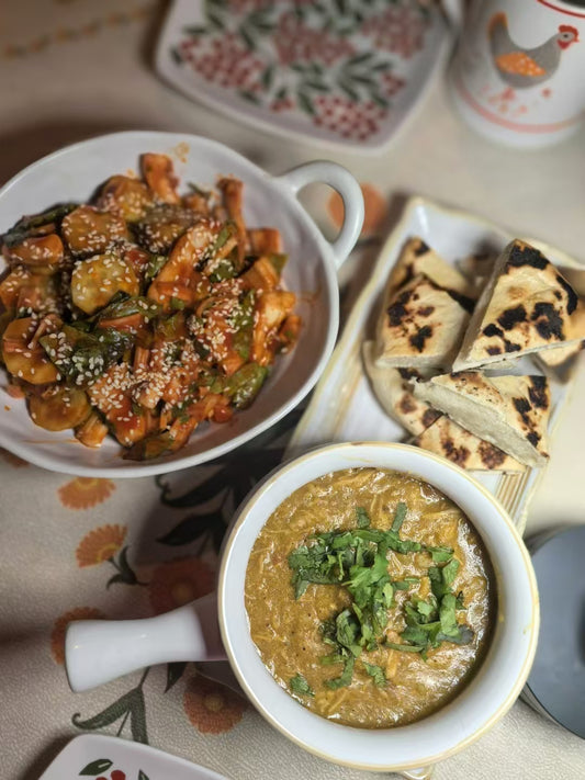 把采集好的叶子装进篮子里,路边找了块大石头我们就开始做植物拓染啦。这个时候小米在帮我们准备下午茶,有上午刚刚从菜市场淘来的长满了刺的火参果,有专门去古城买的绿豆饼,有她自己种的植物泡的草本茶,满满一桌的点心水果!