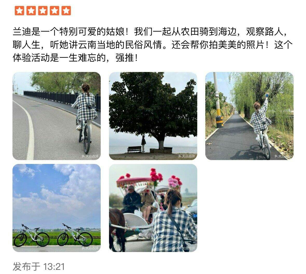 喜洲的魅力在于它的多样性和深厚的文化底蕴。通过深入探索,外地人和当地居民都能在这片土地上找到属于自己的独特体验和感悟。不妨一起骑上自行车,跟着我们深入周边的村落和农田,感受喜洲的农耕文化和白族人的日常生活。这不仅是一条风景优美的路线,更是一条深入喜洲文化和生活的路径。我们可以避开热门景点的拥挤,真正感受到喜洲的宁静与美好。“ -兰迪