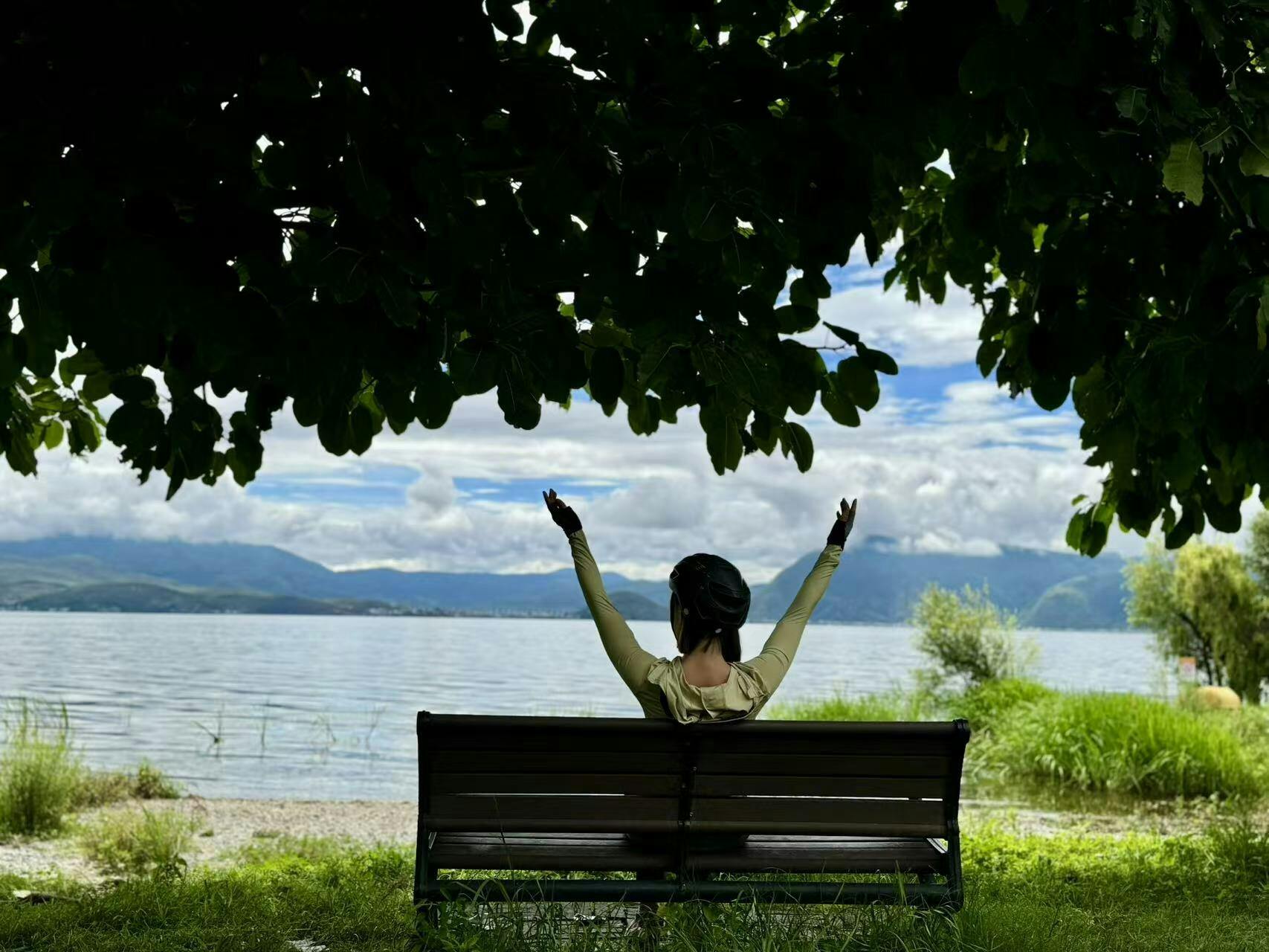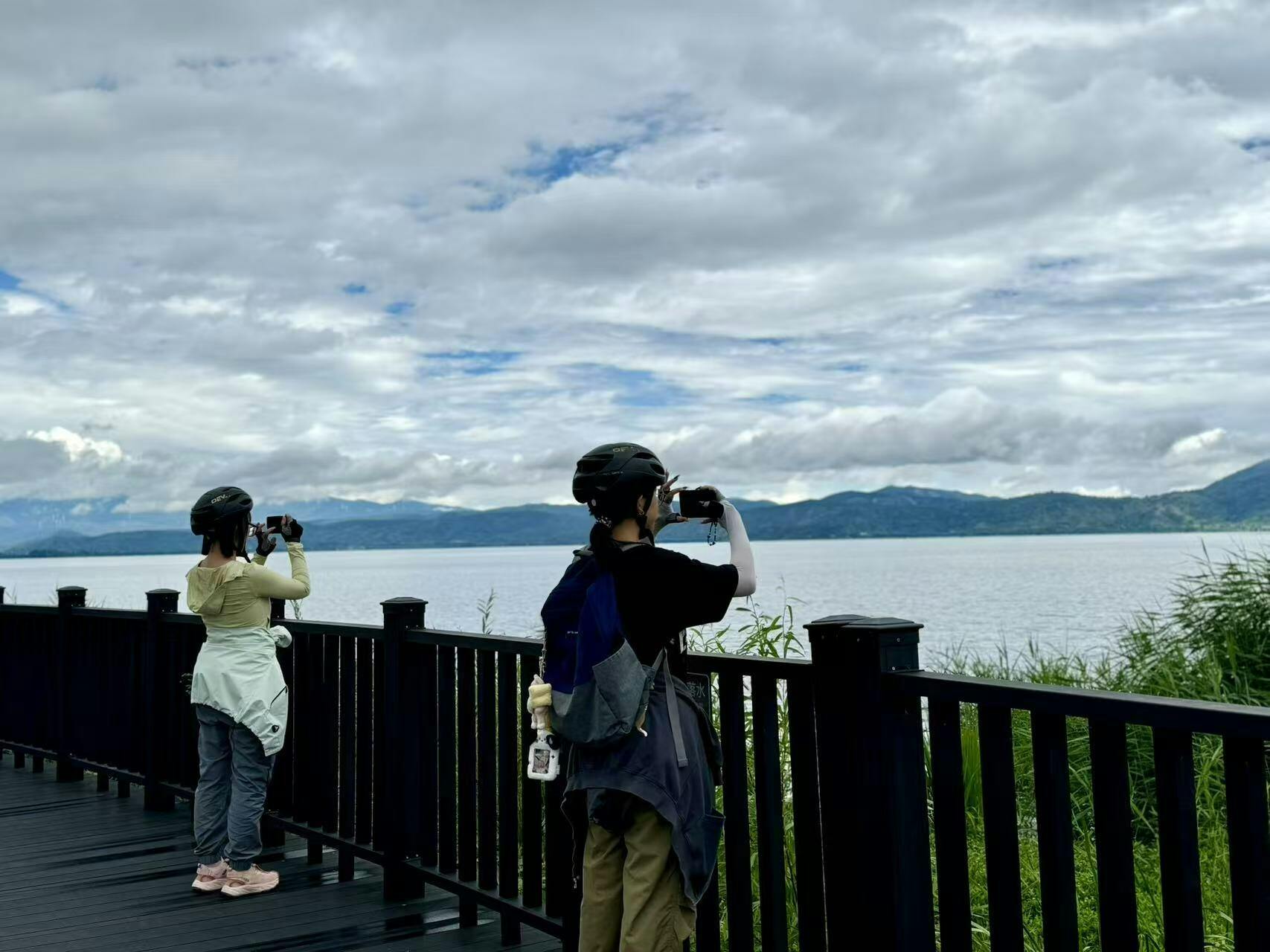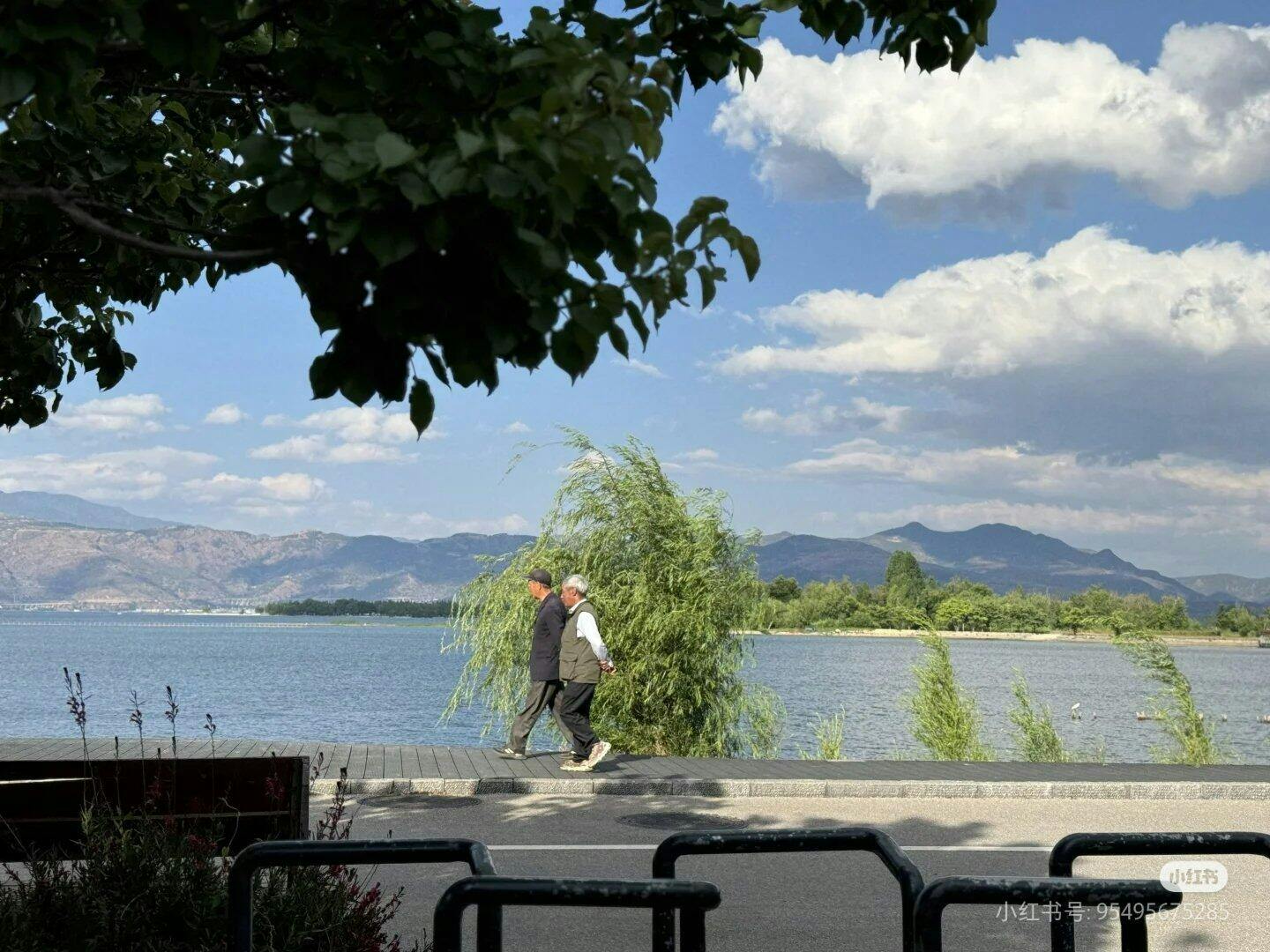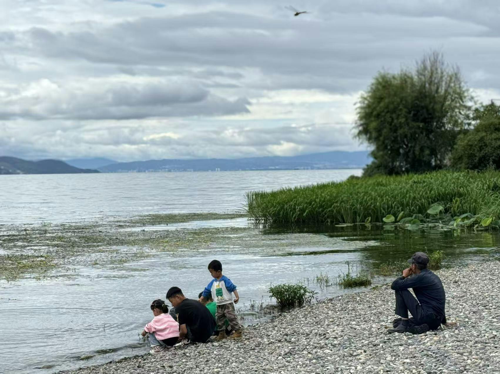 到达海边后视野很快开阔起来,立刻能看到洱海,海里的树,树下的人,还有海对岸的山,海边的风景怎么都看不厌。这里不止是游客的观光地,也是当地村民日常生活的一部分,附近的村民会带着孩子来这里骑车玩耍,海边停着的五彩船舶正是渔民打渔的工具,当然还有五颜六色的游客在这里感受美好,渔民、村民、游客共享大自然的馈赠。