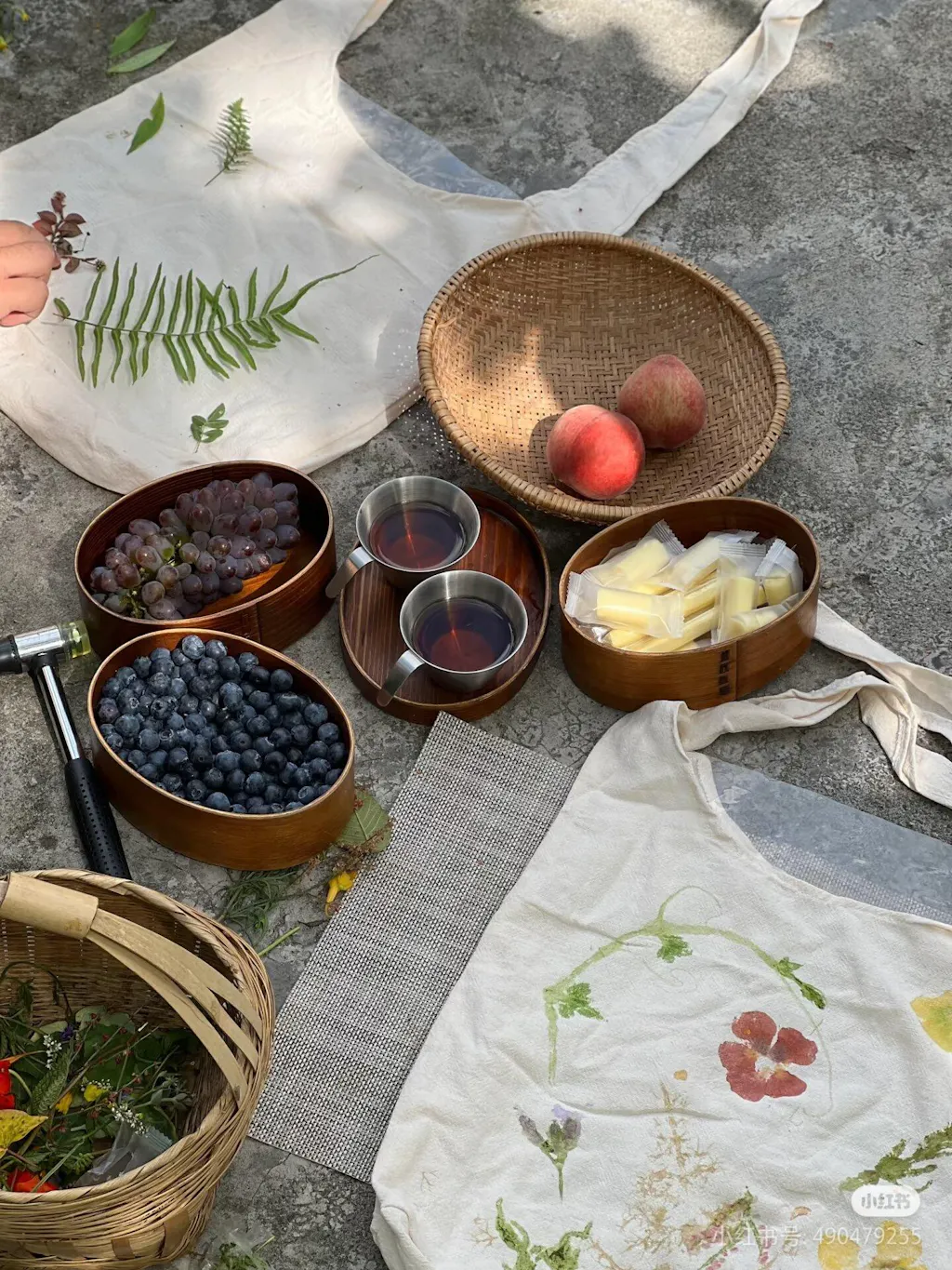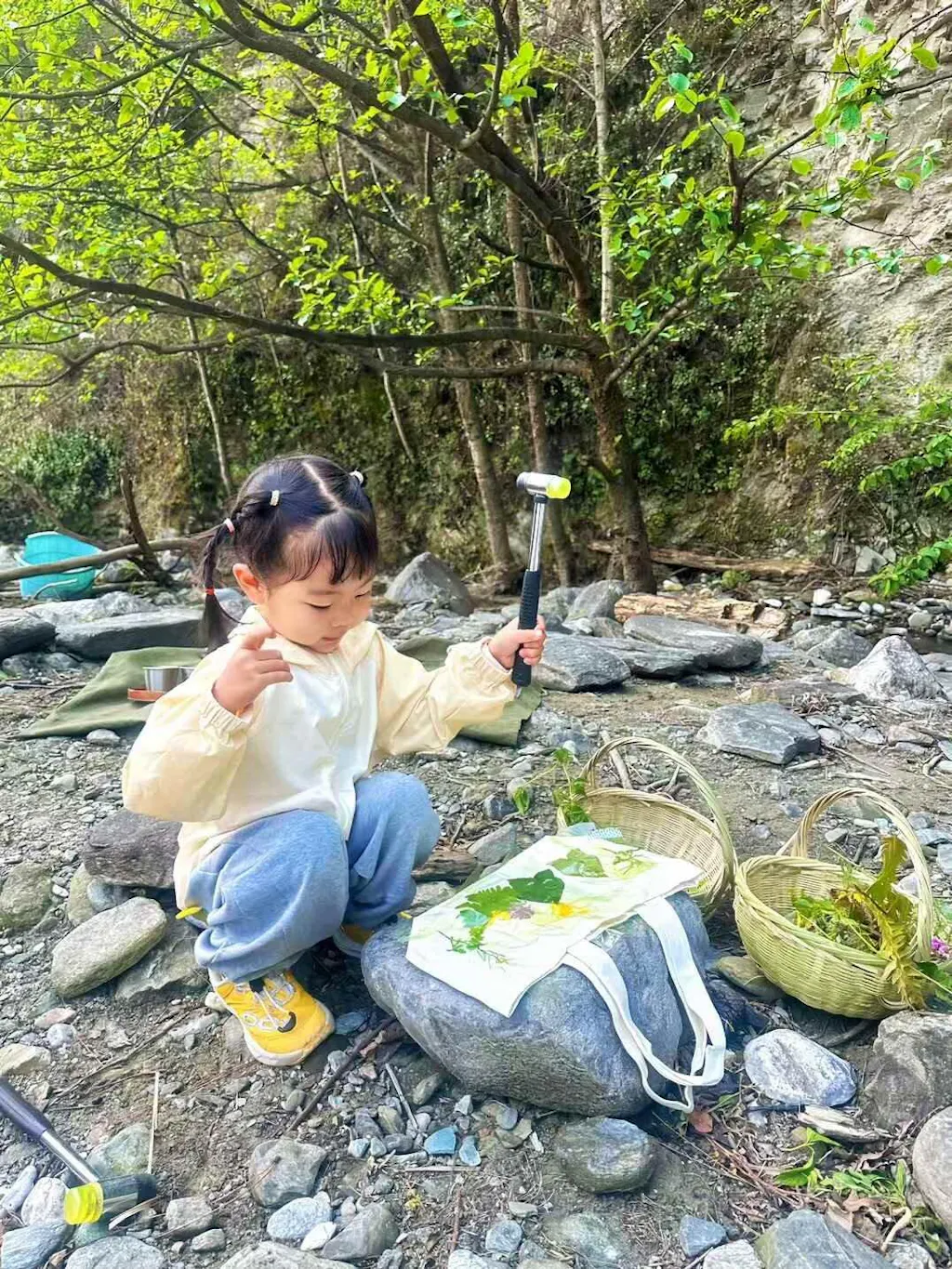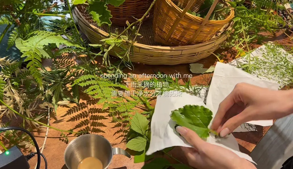 我们就这样一边散步一边采摘,采了好看的花花草草,将它们拓染在包包上,也采了自由生长的野菜,把它们做成了好吃的野菜天妇罗,第一次知道原来紫藤花是可以吃的。