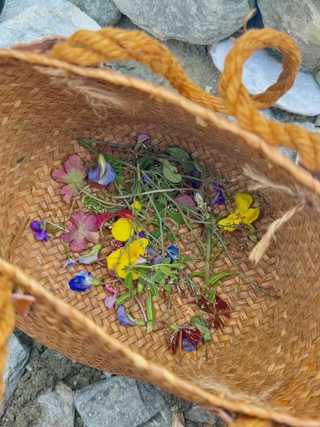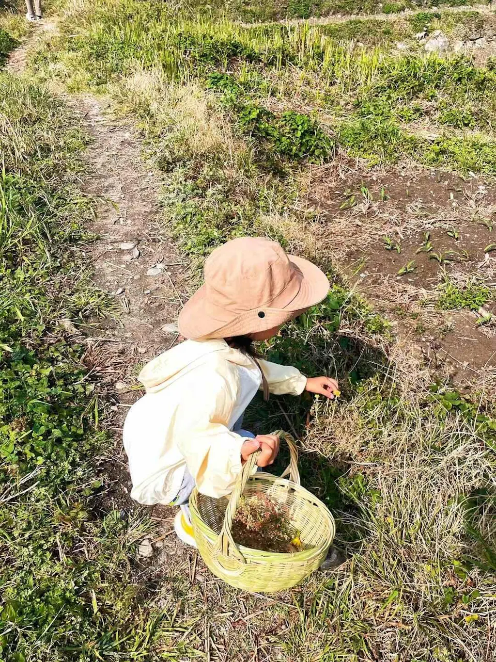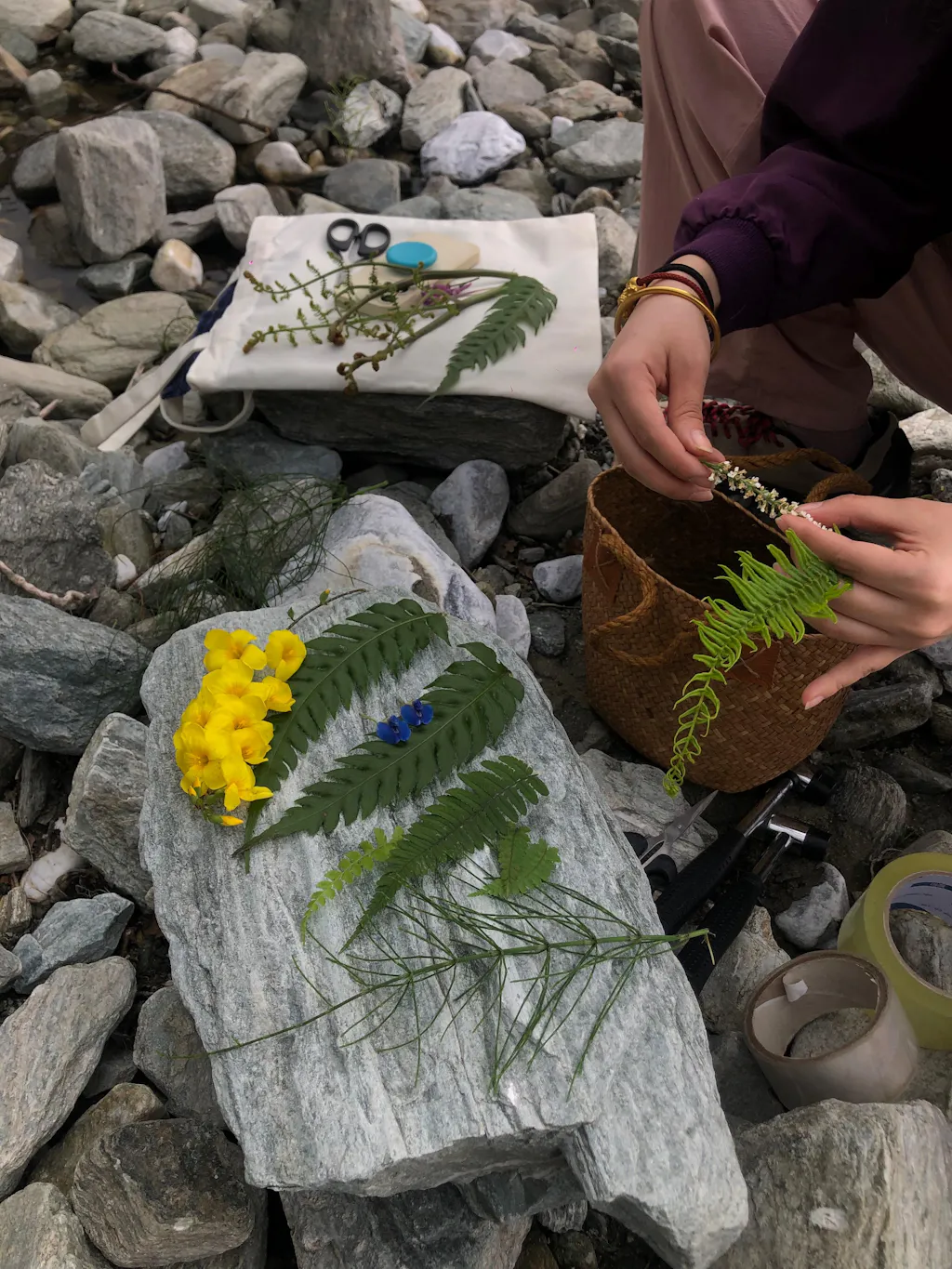 我们就这样一边散步一边采摘,采了好看的花花草草,将它们拓染在包包上,也采了自由生长的野菜,把它们做成了好吃的野菜天妇罗,第一次知道原来紫藤花是可以吃的。