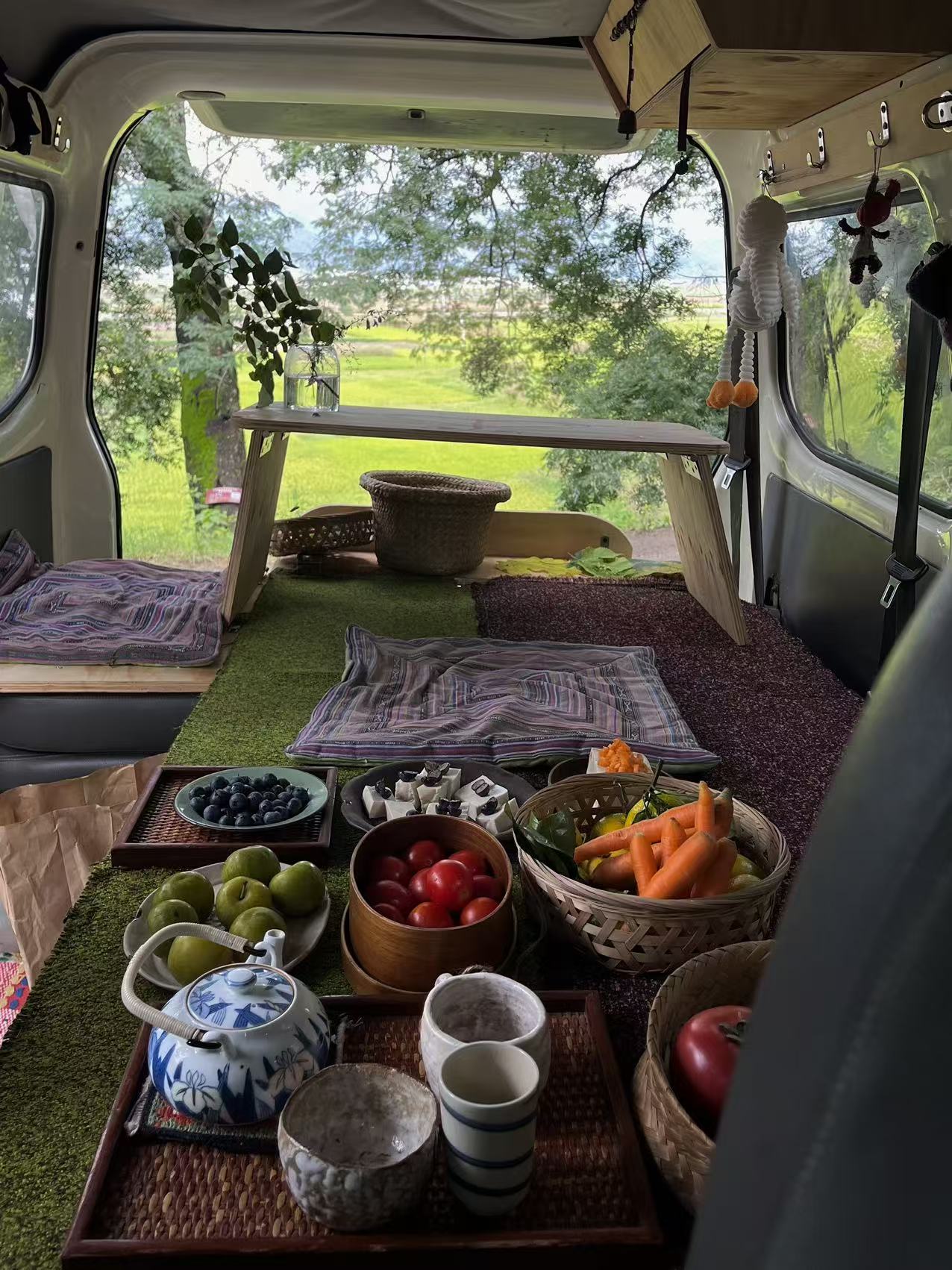 面包车四面被大树环绕,左边是田野,右边是溪流。田野这边偶尔有干活的村民经过,大部分都比较害羞,不会主动和我搭讪。偶尔有两个大哥经过时,对我的炉头很好奇,问了火够不够大,贵不贵之类的问题。而且我在左边的窗户装了磁铁窗帘,完全不想被打扰时,就全吸上。右边的窗户全部打开,因为有树叶的遮挡安全感足够,偶尔还会飘进来一阵花香。